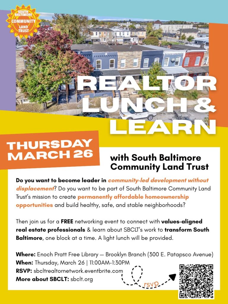 SBCLT wants to connect with values-aligned realtors from across the Baltimore region, and we’re hosting a realtor networking event at 11:00AM on Thursday, March 26 to make that happen. A light lunch will be provided.
